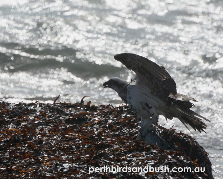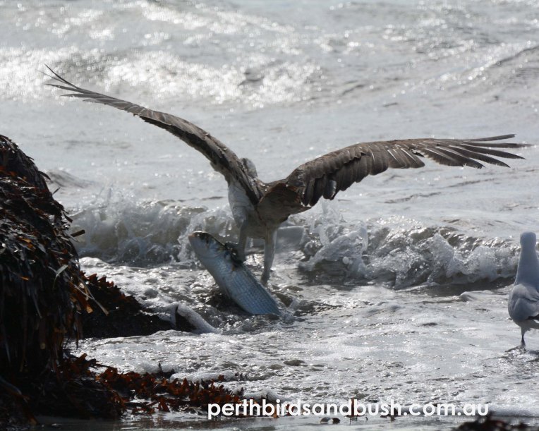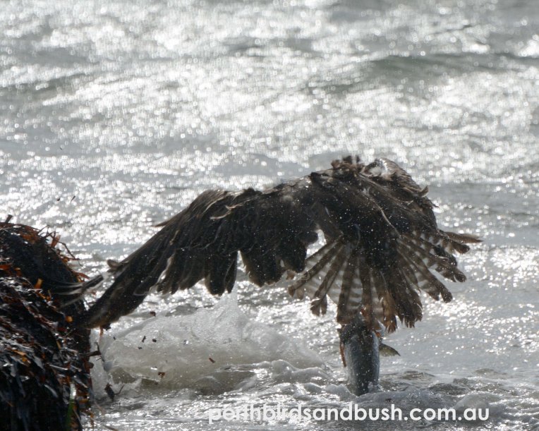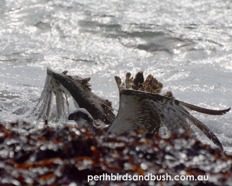 Monday was a stormy day in Perth. Making it a good day to go to the coast to watch the waves and see if the wind wafts any interesting birds to the coast. But it was a fabulous bit of action from an Osprey that really caught my eye! Initially I saw the Osprey plunging into the water just off the shore. Soon after I realised that it had caught a pretty big Sea Mullet and was having difficulties landing it!